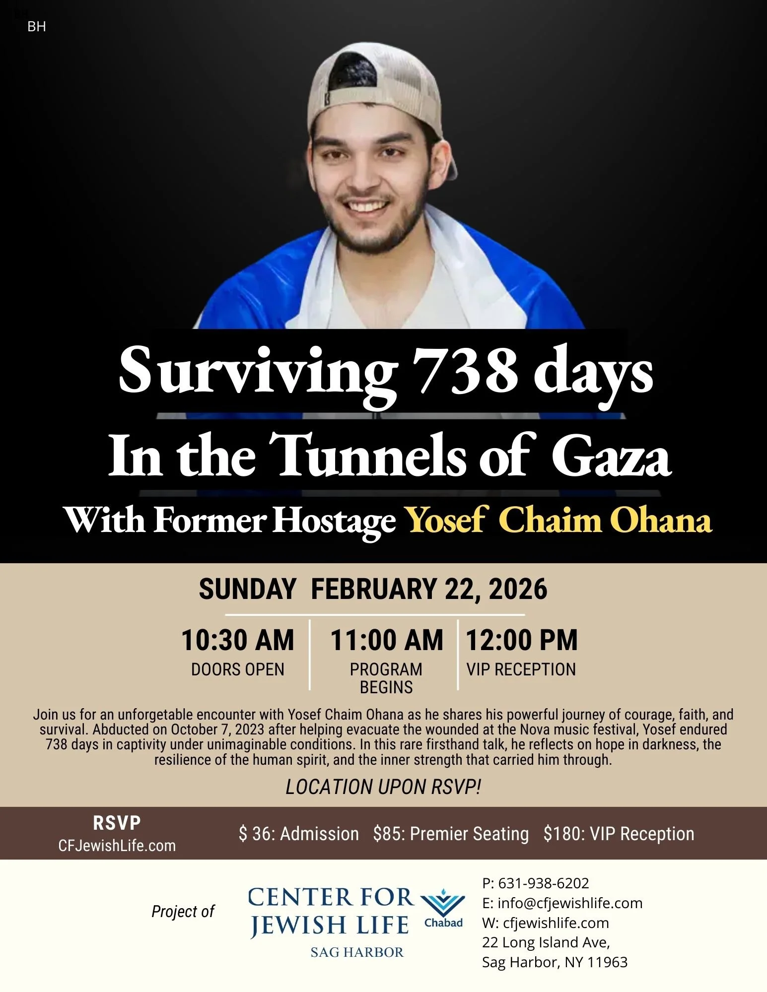 Join us for an unforgettable evening with Yosef Chaim Ohana as he shares his powerful journey of courage, faith, and survival. Abducted on October 7, 2023 after helping evacuate the wounded at the Nova music festival, Yosef endured 738 days in captivity under unimaginable conditions. In this rare firsthand talk, he reflects on hope in darkness, the resilience of the human spirit, and the inner strength that carried him through.