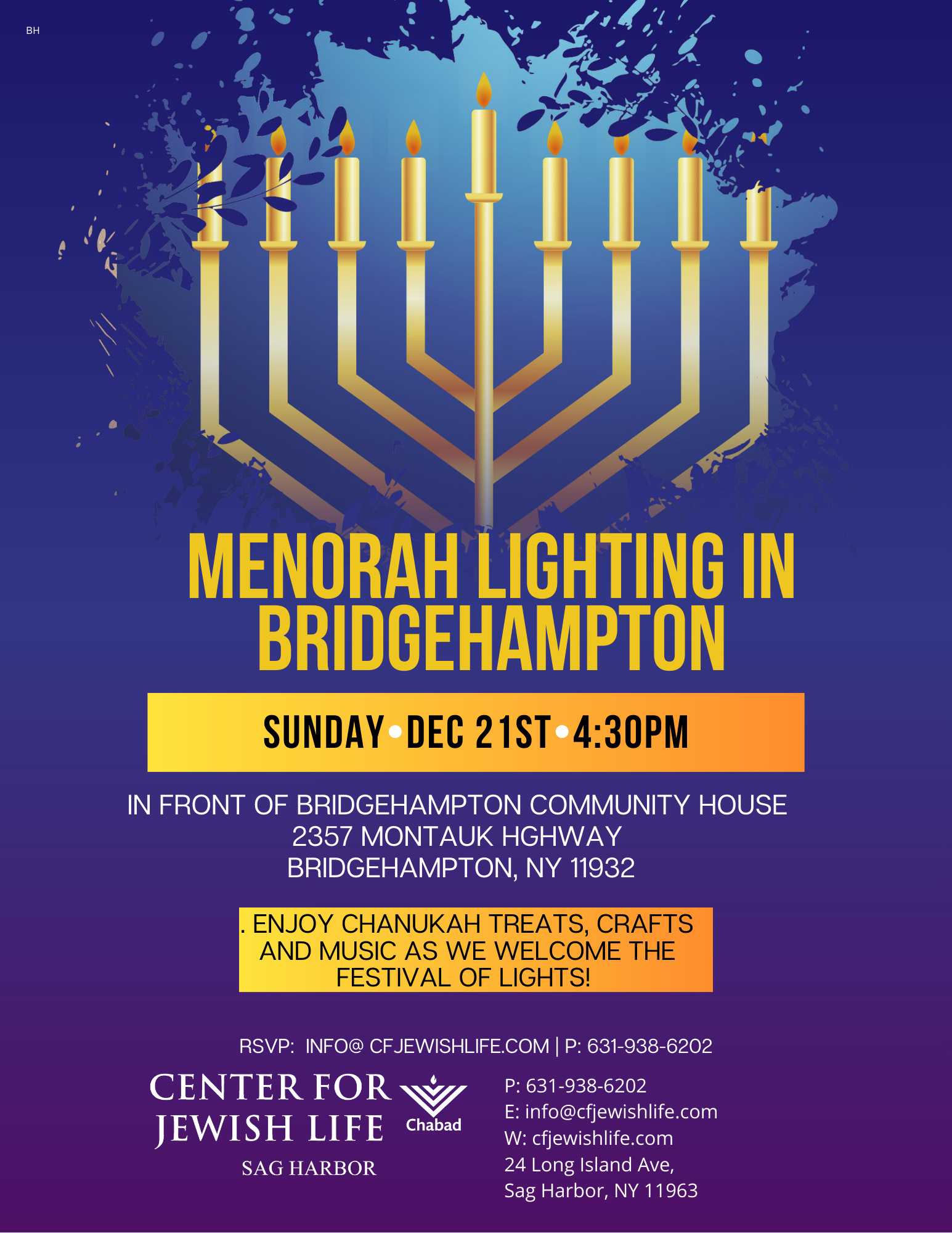 All are welcome to join a Menorah Lighting in front of the Bridgehampton Community House on Sunday, December 21st, 2025 4:30pm.